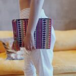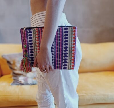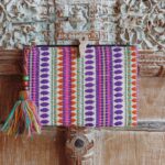 Estuche multifunción tejido perfecto para guardar tus gafas, maquillaje, accesorios o para lo que necesites. Hecho a mano en India, diseño tribal morado con rosa y cierre de cremallera. Medidas: 20cm x 28cm