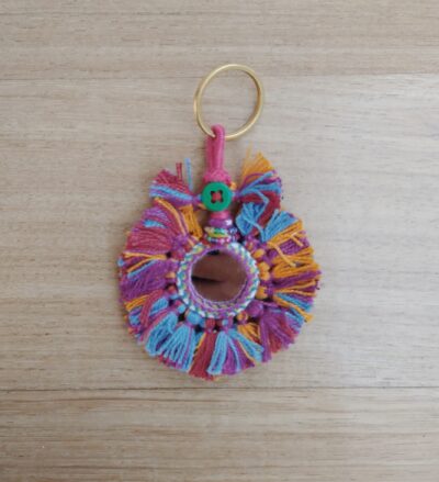 | Hermoso llavero tejido con forma redonda, multicolor, adornos en mostacilla, con espejo y detalles únicos en hilos de seda. Sofisticado, con diseño moderno y precisión en los detalles, que hacen de este llavero algo extraordinario y llamativo. Perfecto para uso personal o de regalo para esa persona especial.
